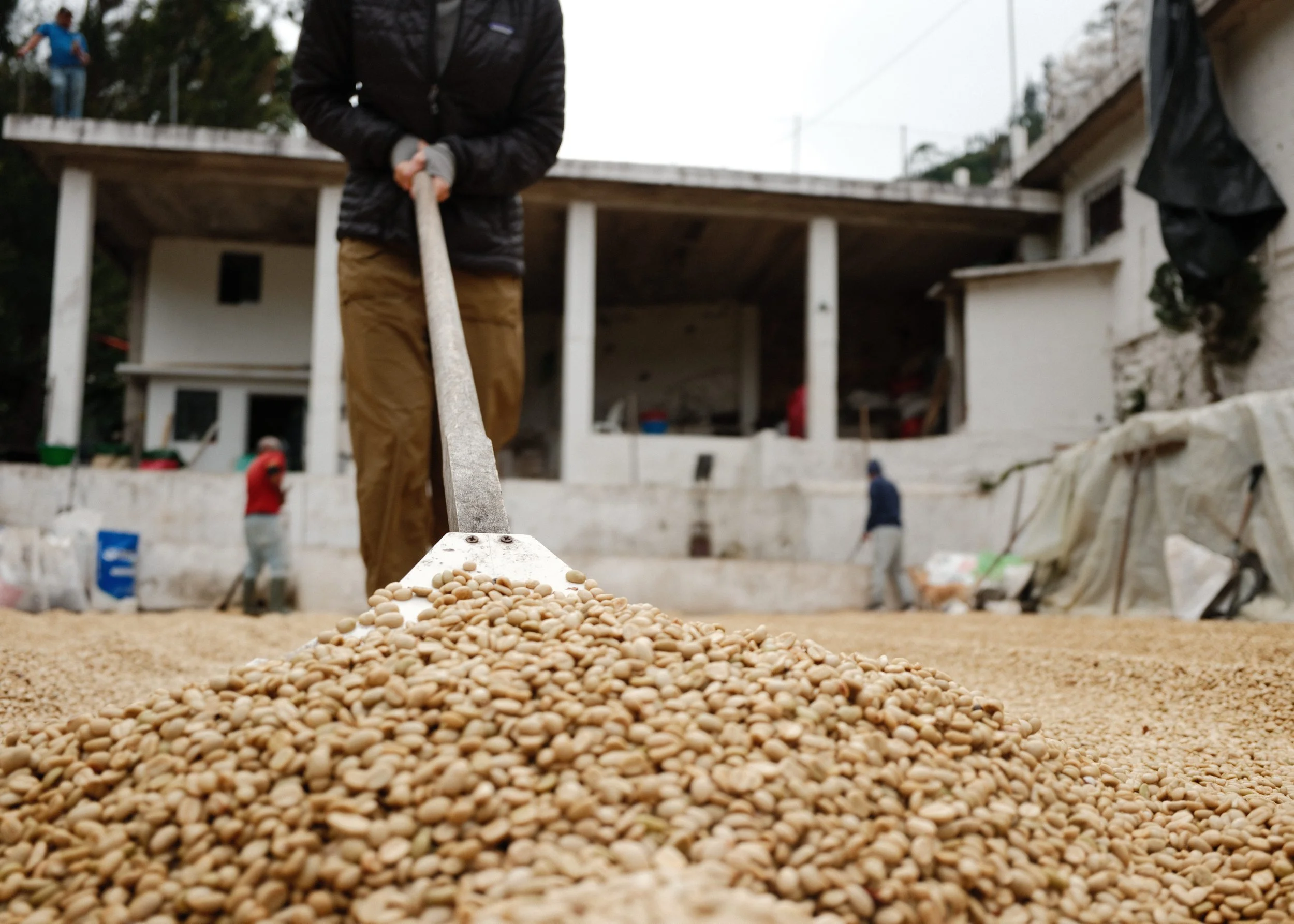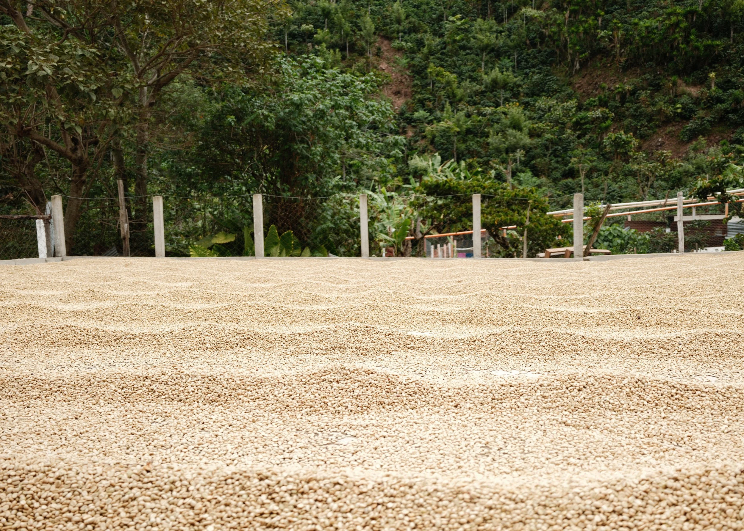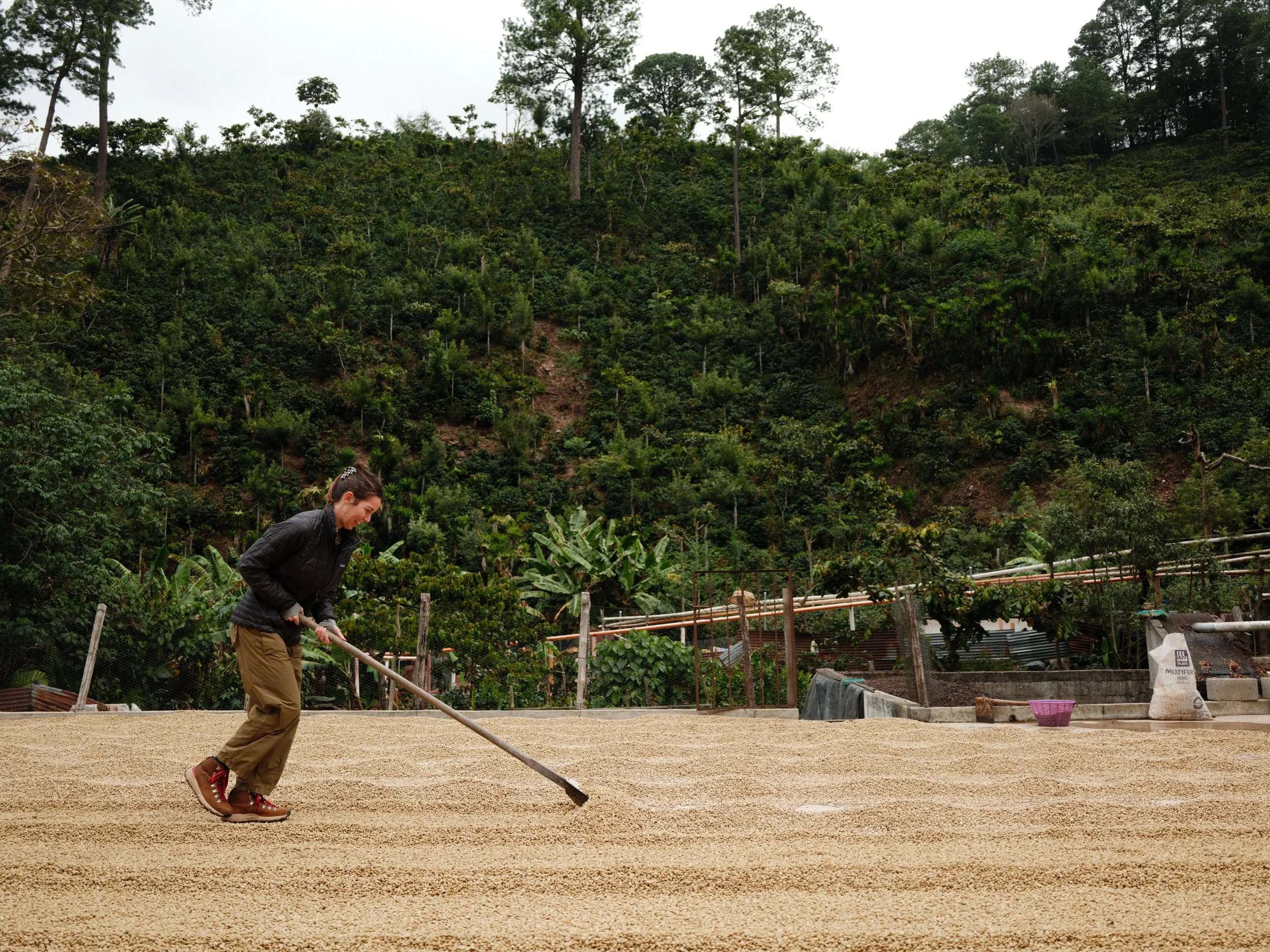 OFF THE PAGE MOMENT: Drying coffee is truly an art form. It’s stunning to look at—those perfectly combed rows stretching across the patio— but timing, strategy, and lots of strength is required to achieve the end result of evenly dried beans. Raking the beans into rows isn’t just for aesthetics; it helps control airflow and ensure even drying in a limited space. Each row alternates between a thin, single layer and a slightly thicker mound, which is constantly turned and combed through with a rake to keep moisture levels consistent. Farmers even adjust the direction of the rows throughout the day, aligning them in relation to the sun so shadows don’t linger and disrupt the process.
