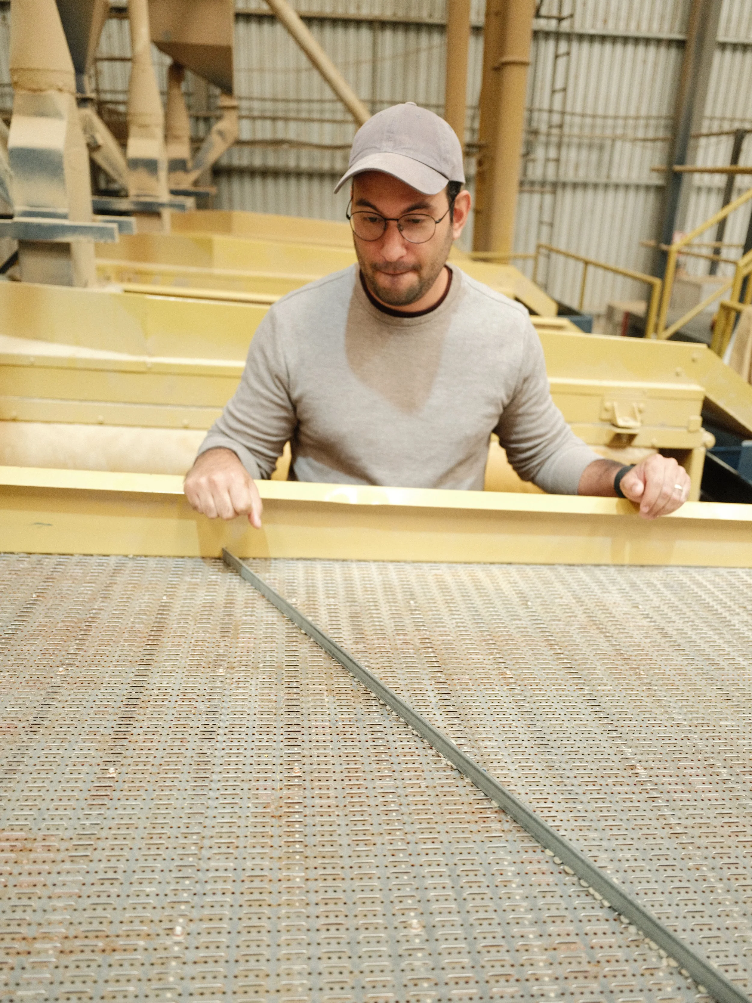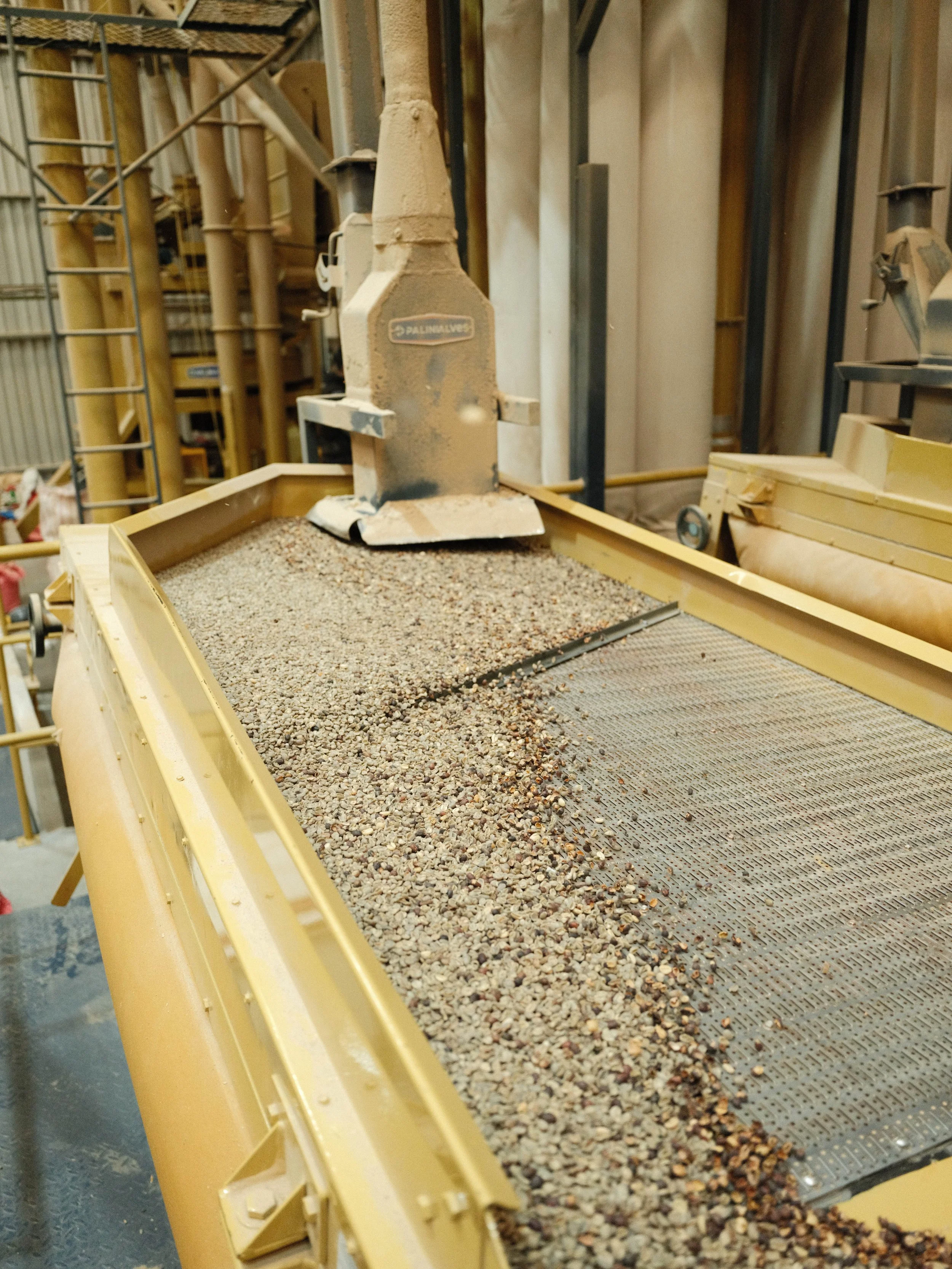 Up next, a series of screens separate beans by size, leaving the largest, densest beans to funnel into bags that will be sealed and shipped out. Beans that don’t make the cut are bagged separately and sold for a fraction of the final rate.