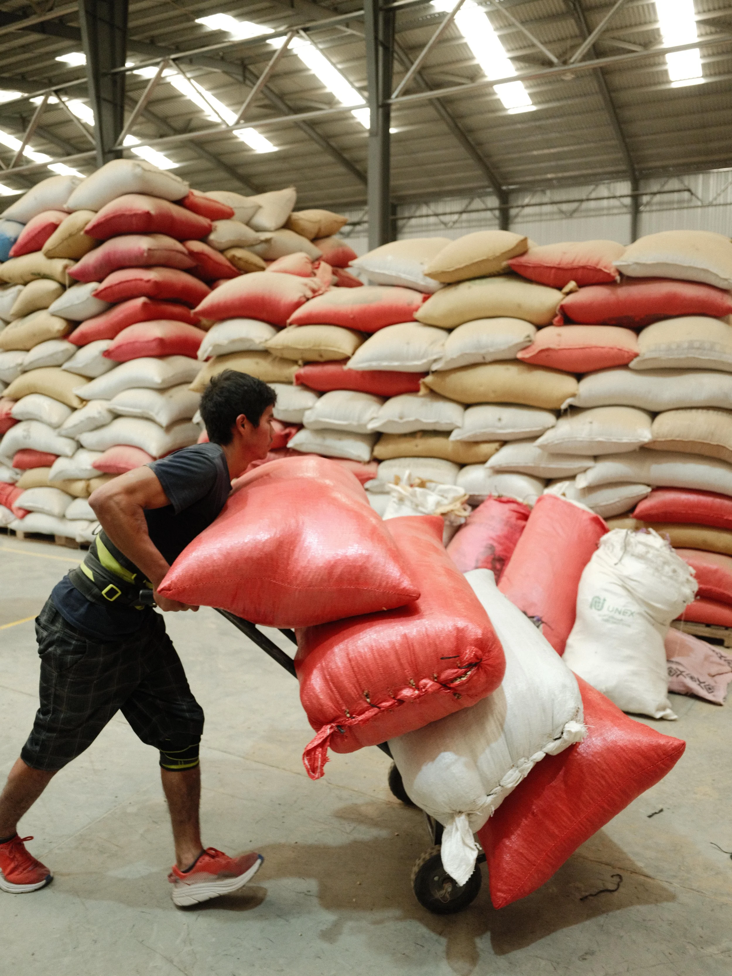 The warehouse—designed by David himself, who is also a mechanical engineer—was stacked high with coffee and buzzing with a handful of workers diligently moving, sorting, and organizing bags.
