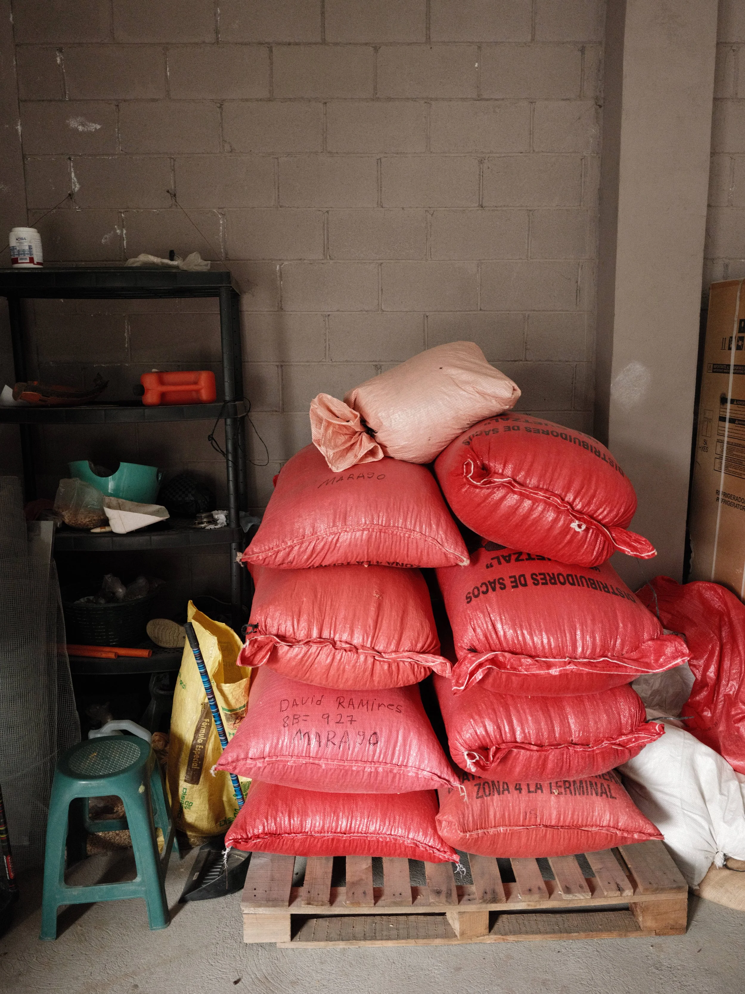 With the mountains in the distance, a crisp, dry breeze in the air, and the sound of squawking from a few errant chickens in a fenced yard, pulling up to the Villatoro Coffee Lab didn’t feel much different than a country warehouse back home. Freshly-laid cement paved a small driveway leading up to a cinderblock warehouse, with a roll-up door revealing a huge space with…a few dozen coffee bags.