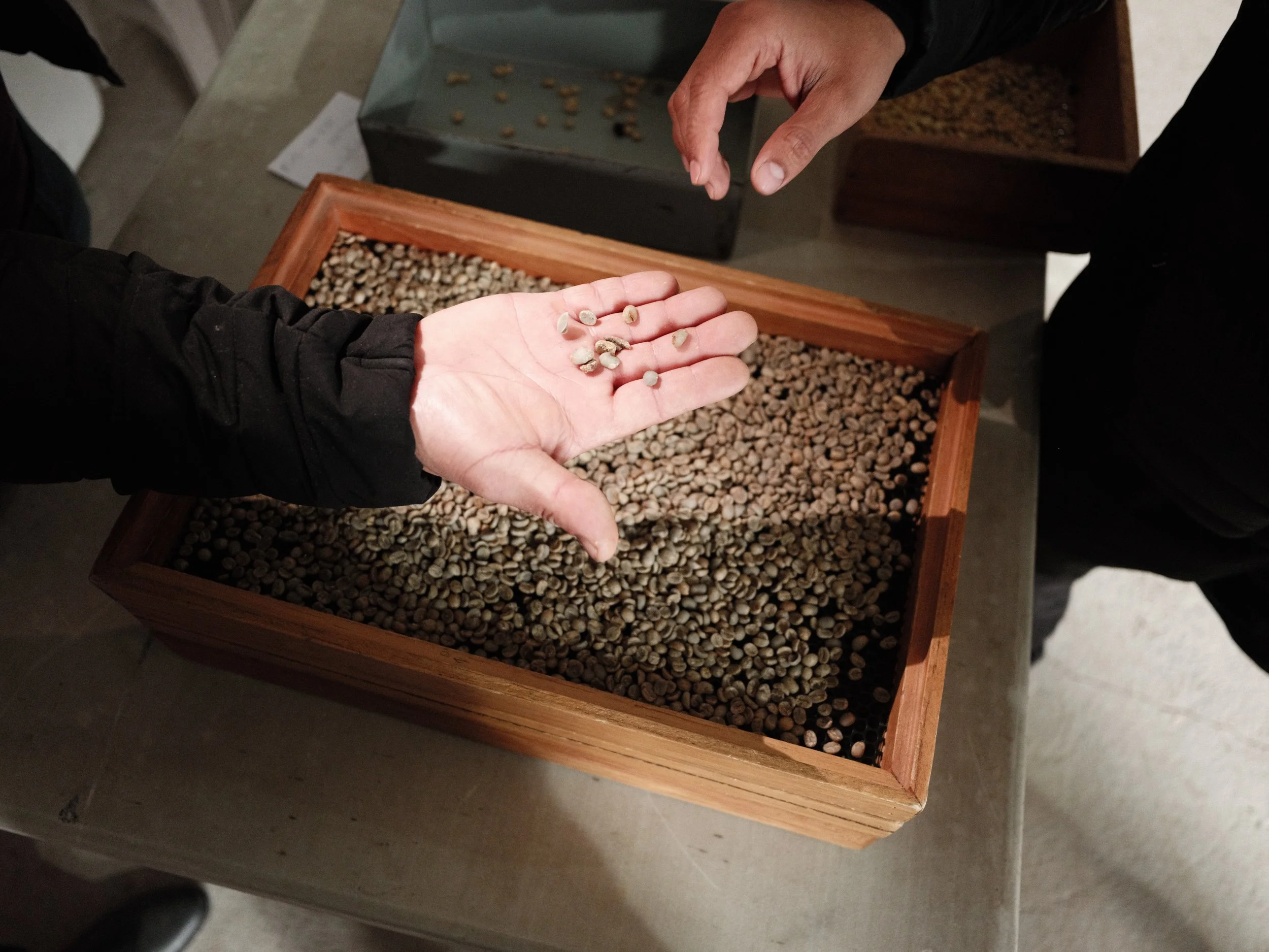 So, our Onyx account manager, Rachel, grabbed samples from five separate coffee bags (to get a more uniform sample of the selected coffee) and brought it to the mill, which removes the outer parchment (a papery, thin shell that protects the green coffee during its journey from farm to processing mill). Next up, green beans hit the sifting pan to remove any defective beans, sticks, rocks, etc. What’s left: uniform, freshly milled coffee that’s ready for the roaster.