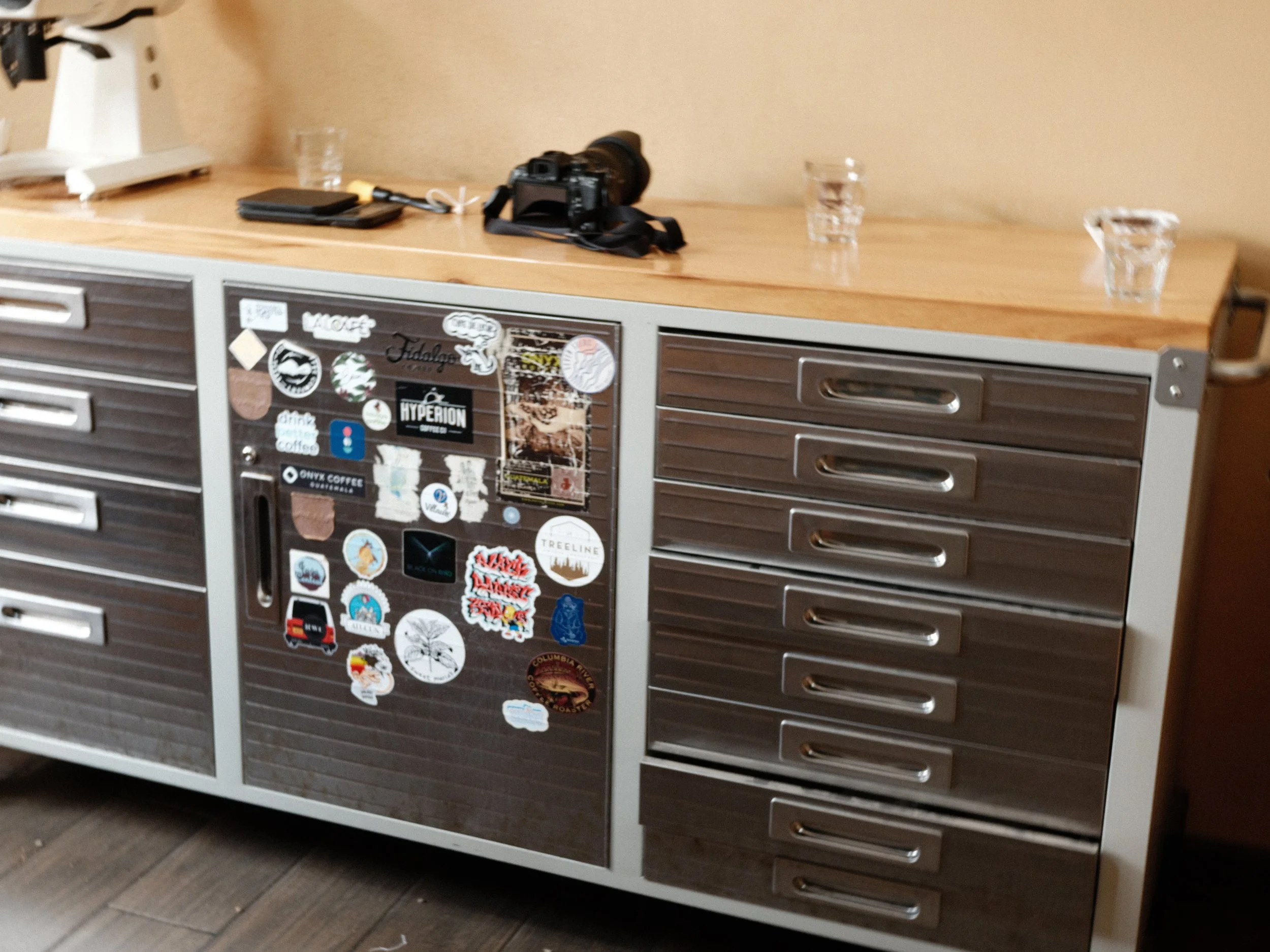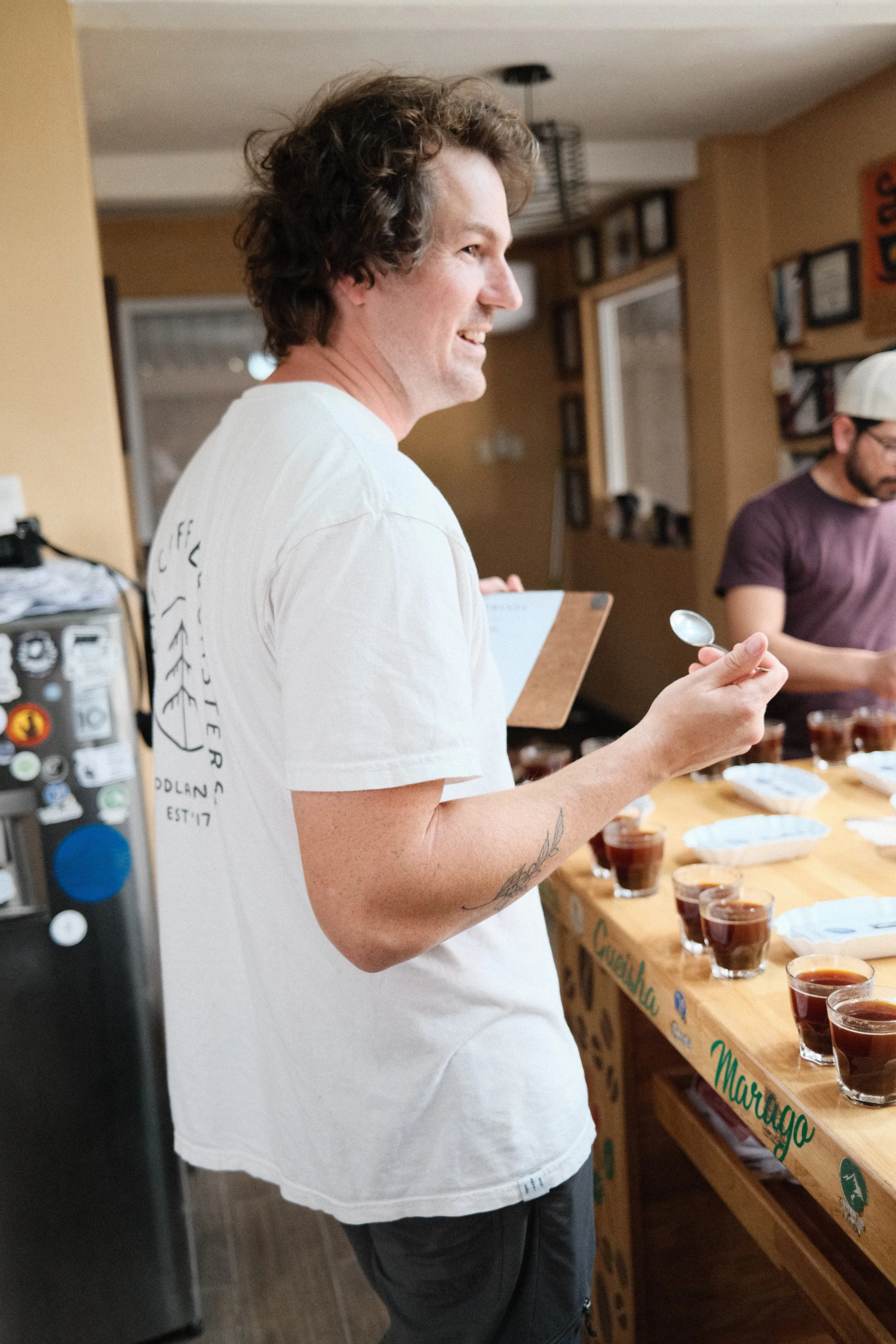Have we ever been so excited to cup coffee? Nope. Ben was simply giddy while Jenner, Rodin’s brother and head of QC, prepped our cupping at the Lab upstairs. With a spacious, high table, windows offering panoramic views of the blooming countryside beyond, and 1970s pop humming from a Bluetooth speaker in the corner, the space felt wildly familiar to one we would experience at home.
